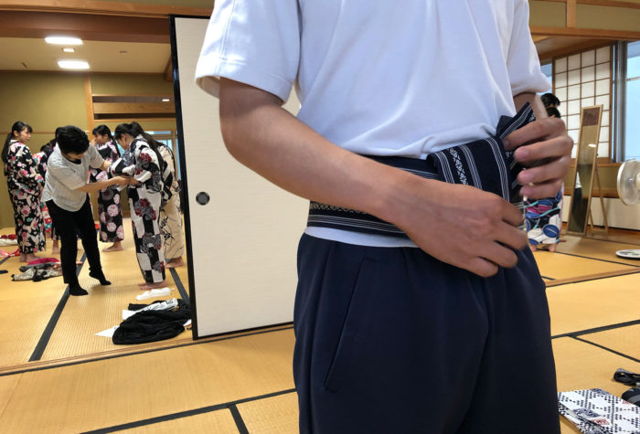 その大広間から襖一枚を隔てて、野球部の彼と1on1。まずは浴衣を着ずに帯結びから。先生から「昨年以上にやりますよ」と聞いてはいたものの、飲み込みが早いのと手つきの良いこと。まぁ僕がバッティング(なんて知りませんが)に例えながら教えたことが真面目な彼の笑いを誘って功を奏したに違いないのですけど(笑)。浴衣を着てからも上手に着れた上に、もたつく女子たちを横目に畳み方まで習得。目指す理学療法士への道は間違いないな。