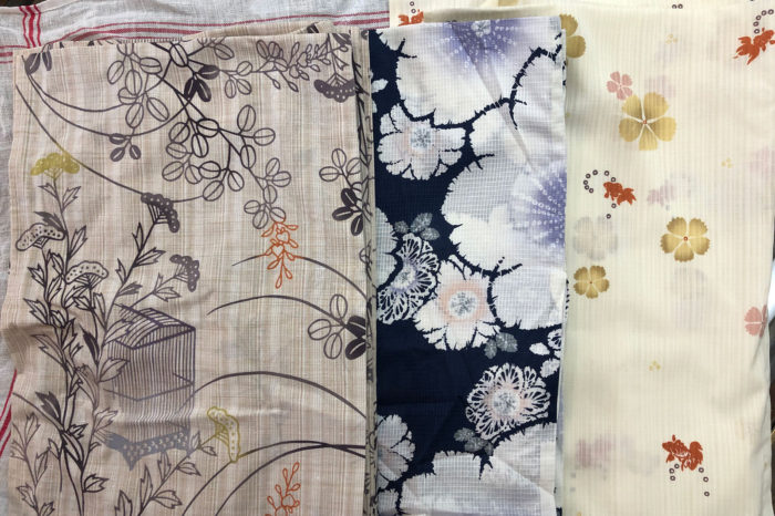 右から順に、まずはポリエステル製の浴衣をお食事会に、続いて綿紅梅の浴衣をお誕生会に。覚えている方もいらっしゃるかも知れませんが、つい先日お買い上げ頂いた一枚は花火大会に。それぞれ若女将が着付けをお手伝いしては、お出かけになりました。それぞれ一度ずつ、お召しになって丸洗いへ。汗はもちろん食べこぼしなど汚れ落としに続いては、綻んだ箇所をちょちょいと解れ直しを。まだまだ蒸し暑い夏は続くので、浴衣じまいだなんてなんだか寂しい気がする反面、大切にお召し頂けてるのがわかるので嬉しい限り。自分で着て、ご自宅で洗って頂くのが一番ですが、こうして着付けやお手入れをお預かりできると、お召しになった姿が拝見できたり感想を聞けたりするので一同さらに嬉しくなります。
