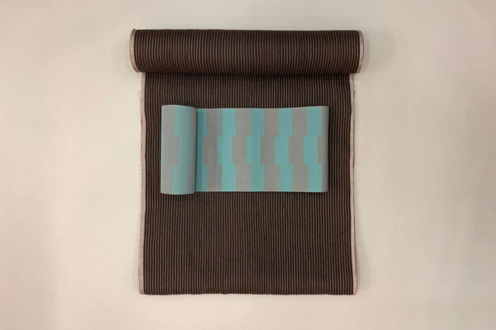 そこで若女将と事前に相談をして、「次回ご来店時には絶対にお母さんの選ぶお母さんに好みによるお母さんのための一枚をおすすめしよう!」と心に決めていました。ところが本日もご来店されると「見ると欲しくなるね、」とおっしゃっては、またしても「うちの子だったらこれよね」と反物コロコロ。「いや、今回はお嬢さんのお好みを棚の上にあげて、まずはお母さんのお好みで選びましょう!」と若女将がズバッと。で、決まったのが写真のチョコレートブラウン×ピンストライプの近江上布に、この上ない組み合わせの博多織紗献上の半巾帯。ほかにお手持ちの母娘兼用浴衣や半巾帯とも相性抜群。「これなら私がきた後に娘も着てくれるよね、」と相変わらずの親心には一万歩譲って。