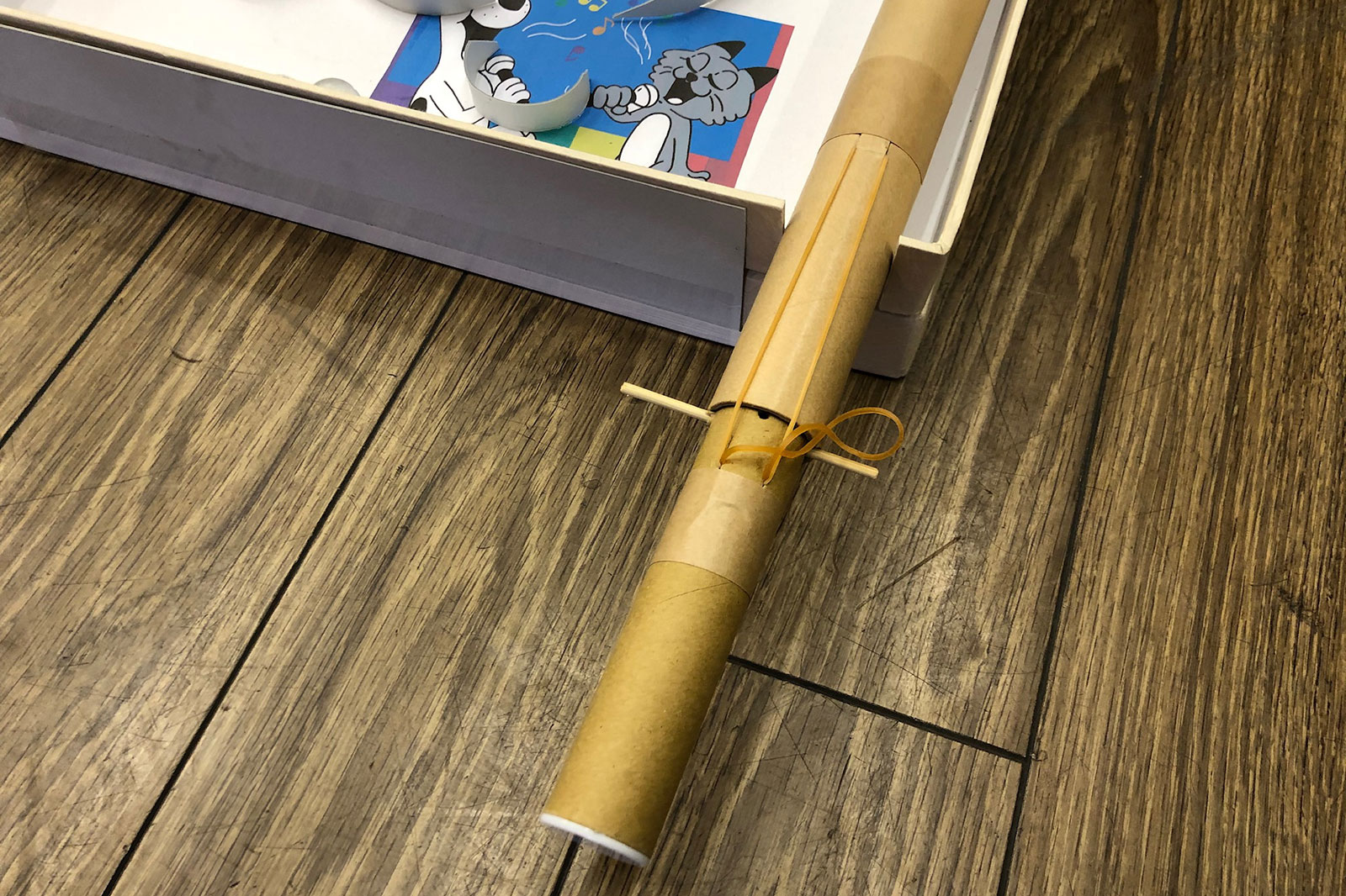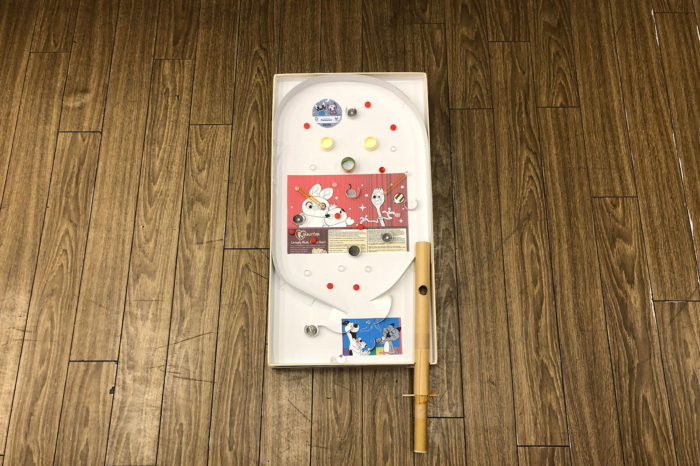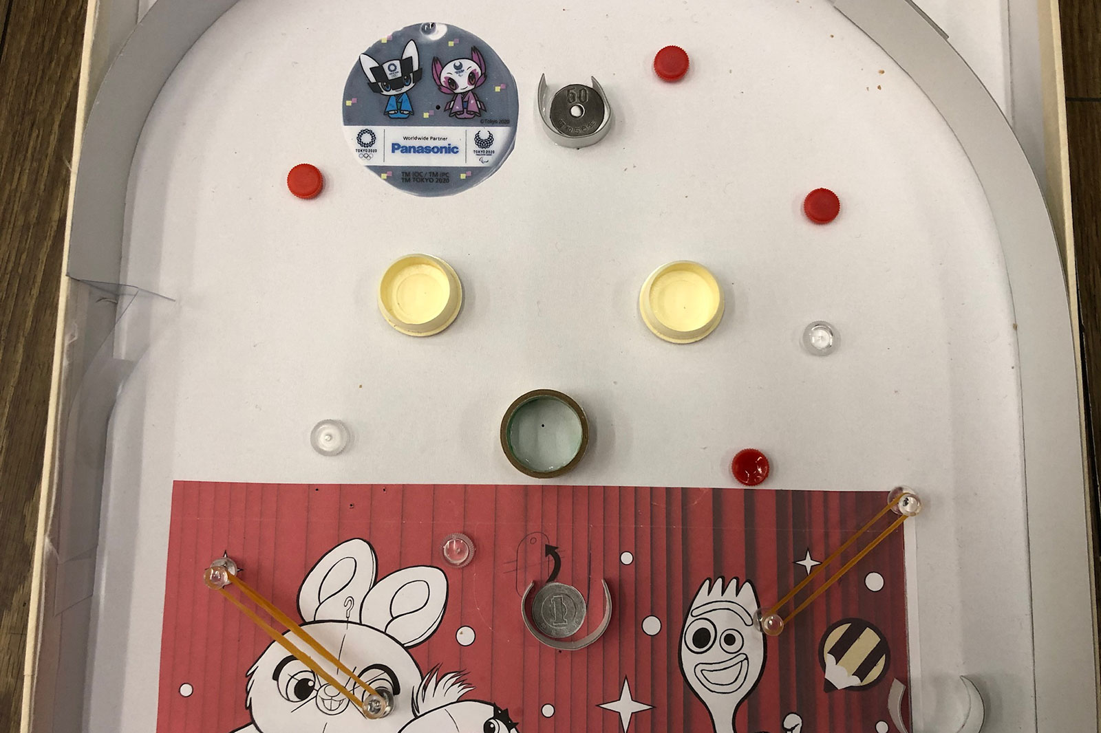 近所にある駄菓子屋さんで買ったラムネを飲み干しては取り出したビー玉を元手に、反物の巻き芯棒と輪ゴムを頼りに発射。白や赤の画鋲や巻き芯の蓋が釘代わり、マスキングテープの芯を切った穴に入ると硬貨をコピーした額面のお小遣いをゲット!それを元手に駄菓子屋さんリターンズ。