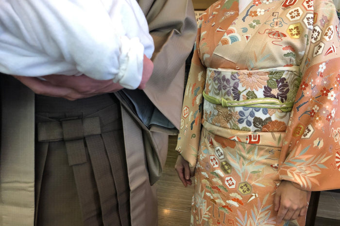 お祝いの気持ちいっぱいに結城紬の無地をお召しになったおばあちゃん、専属カメラマンや荷物持ちなど雑用係を買って出てスーツ姿のおじいちゃんも一緒に。御召に羽織袴のお父さん、豪華な訪問着に唐織の袋帯を結んだお母さん。生まれてはじめての氏神様への奉告を御家族みんなで祝えることほど幸せなことはありません。お母さんは女将と若女将が着付をお手伝い、「自分で着れる」と言っていたにも関わらず「ここはこうだったかな?」と確認するふりをして僕の出番を待つお父さん。まだまだやな、抱っこもぎこちないったらありゃしない。