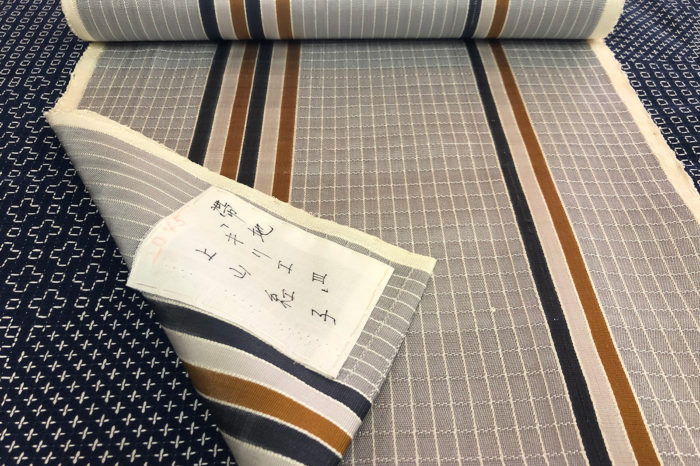 箱から取り出すと、日本工芸会正会員の染織作家・上山紅子氏作「キリエⅢ」という作品。細い縞の格子中に小粋な6本と3本の縞がお洒落ななごや帯。表は格子ですが、お太鼓の裏側だけ縞という、見えないところの柄に遊び心を加えられているというのが本家本元の染織作家らしくって。見えないお洒落ってほら、さらに自己満足感も膨らみますし、まわりの方に気付いてもらうと「えっ、そうですか?」なんて言いながらも嬉しかったりするじゃないですか。それですよ、それ。ということで、お仕立てを承りました。そのほか絞りの羽織に合わせて羽織紐もお買い求め頂きました。