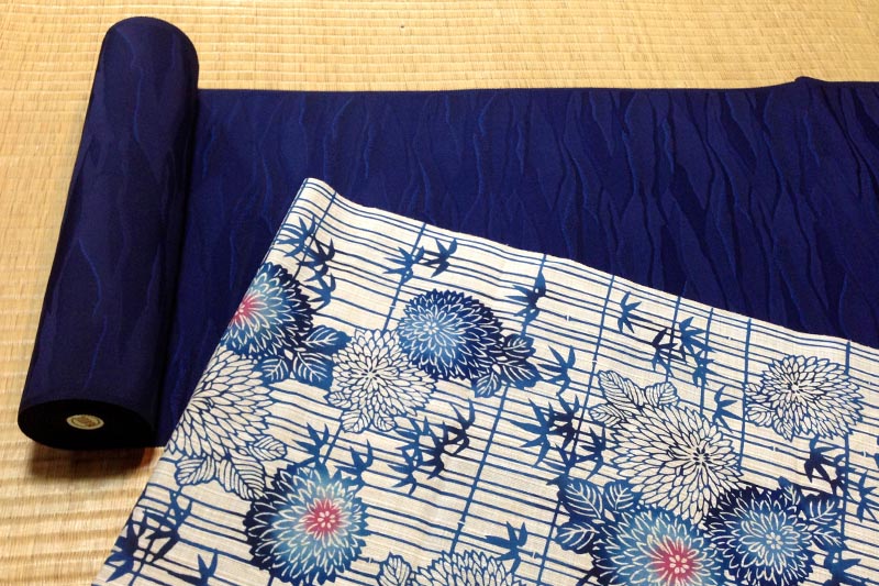 相変わらず天然藍に染められた新作の数々は人気が高く、朝イチから次々とお嫁入り。残念ながら小物や洋服が中心なのですが、最後の最後に天然藍たっぷりの色無地が一枚。と同時に姉妹のような母娘でご来店のお客様に浴衣をご注文頂きました。最初はカラフルな色柄ばかりをご覧になっていたのですが、すぐ近くにあった藍色に影響されたのか、いくつかお選びになった中から写真の一枚を。夏に向けて自分で着れるようになりたいです!と、若女将のワンコインレッスンへの入門を決意。とっておきの夏になること間違いなし!ですね。