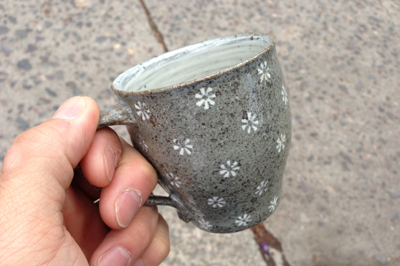 右も左も知らぬ存ぜぬの阿蘇神社門前町。行きがけに熊本在住で陶芸をやっている知人から「門前町においしいパン屋がありますよ」との情報を得たので、大先輩方がゆっくりと参拝していらっしゃるのをよそにパン屋を探して。仕方が無いからと場所を尋ねに入ったラーメン屋さんで「となりですよ」なーんて恥はかき捨てといて、店内の香ばしいコーヒーとパンの香りにノックアウト。さっそくパンを手に唐津から来たことを話すと、「あら、井銅くんの紹介ですか。そちらの棚に置いてあるのが井銅くんの作品ですよ」。というワケで記念に、若女将へのお土産としてマグカップを購入。