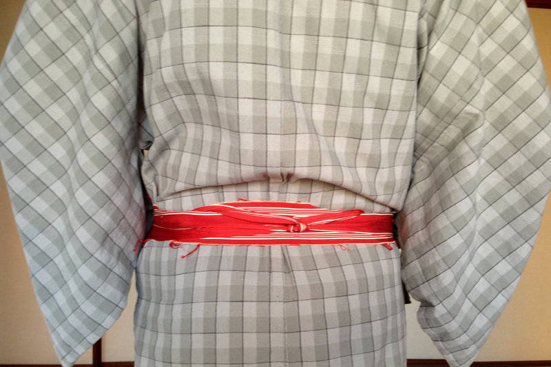 男〆とは帯を結ぶ前に結ぶ下帯のことで、腰紐よりも巾が広いため、きものをしっかり抑えてくれて着崩れしにくい。以前から不快指数が高かった、この男〆の結び目。要は帯ときものの間に入れた携帯電話や車の鍵などを取り出そうとすると、いちいち結び目がほとけて携帯や鍵についてきてたんです。毎日「邪魔だなー」と思ってはいたんですけど、ある朝ふと、「そうだ!後ろに結べ(正確には前で結んで後ろにまわせ)ばいいやん!」とひと手間。これが実に快適。