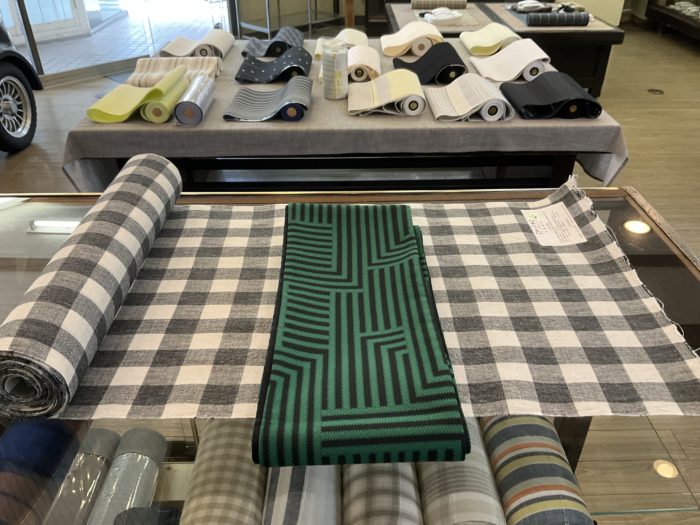 今朝も朝一番で3名様のレッスンでした。おふたりはもう1年近く続く優等生、もうおひとりは先月あたりから仲間入りされた、言わば新人さん。お三方ともレッスンに熱心に取り組まれているのがとても嬉しいのですか、優等生のおふたりはレッスンでお召しになったままランチに向かわれるのが恒例行事で楽しまれている様子がさらに嬉しいのです。本日もレッスンを終えて2階から降りて来られると、おひとりは琉球絣のきものになごや帯、もうおひとりは大島紬になごや帯、で新人さんは降りてこられるや否や「これ、木綿ですか?かわいい!」ってガラスケースに並ぶ中から候補は2反。鏡越しに着姿を想像して、、、写真の一枚(綿麻)に決定!帯もあっちの方から見つけて来られてハイッ!ご覧の通り。
