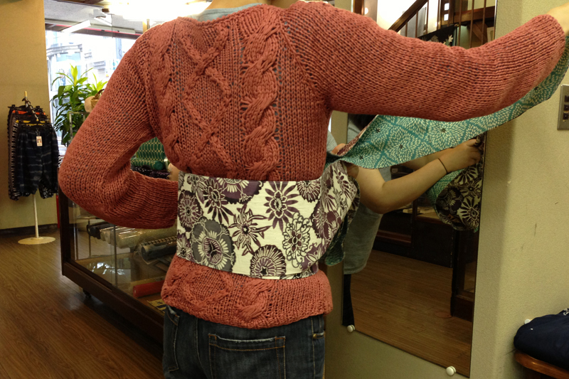 仕立て上がったゆかたを取りに来てくれた友人が、「帯の結び方を教えて欲しい」ということで若女将とさっそく。写真はオシャレな三橋工房の両面細帯で、長さもたっぷりあるので変わり結びをいくつか。タンスに眠っていたお母さんの丸帯を仕立て替えたもう一本の細帯とともにゆかたにピッタリで、それぞれに合う帯〆も合わせて今夜復習することを約束して解散。二本の細帯の封を切ってくれたことはもちろん、このところの彼女とその周辺にあるきもの熱には恐れ入谷の鬼子母神。