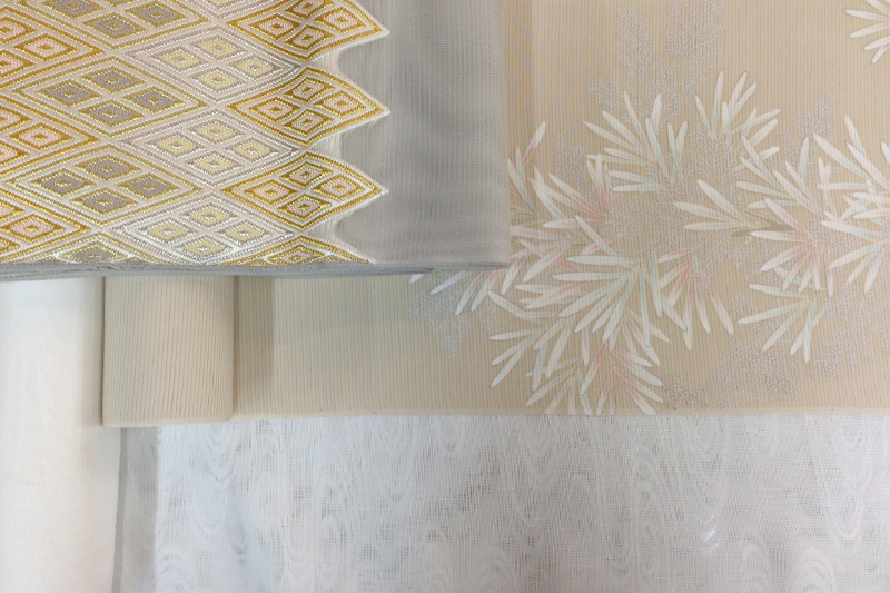 紗や絽、羅などの盛夏向けの生地のことを「うすもの」と言います。今年は例年になく「うすもの」の動きが活発で、先日来の紋紗襦袢と言い、ここ数日はおかげさまで好況が続いております。というワケで本日は朝から紗の付下+紋紗襦袢+絽綴の袋帯+小物に加え、草履のご注文まで頂きました。そして極めつけは、売り切れ寸前で追加注文していた紋紗襦袢を取引先が持って来たところへ、うすものの襦袢を欲しがられていたお客様がご来店。ほんのり若葉色に染められた一枚をご予約。