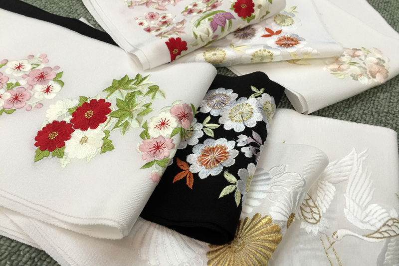 弊社ではあまりオススメすることのない刺繍の半衿。来月の企画展の中でご紹介することになり、その先陣を切って10枚ほどが届きました。白地に白と金のみを刺繍した清楚なものから、白地に色糸、黒や赤など色の生地に刺繍を施した豪華なものまで多彩な顔ぶれ。価格はミシンや手縫いによって異なり、6,000円〜50,000円と高いのは上物の長襦袢並みの高さ。ですが写真よりも実物をご覧になると「なるほどね、」と納得頂けるハズ。