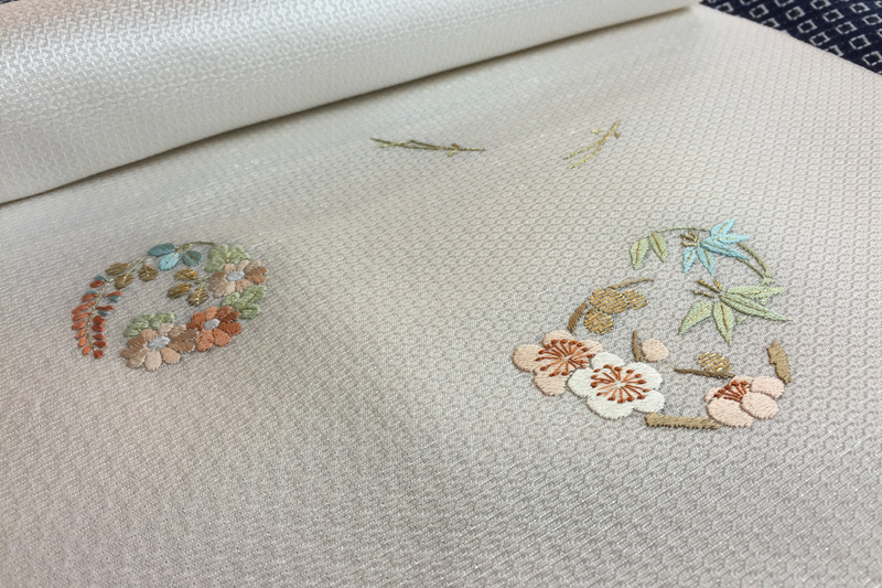 ひと針ひと針、手で刺された糸の輝きが素晴らしいなごや帯。