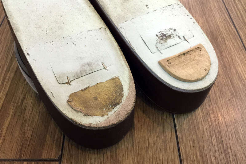 「凸凹道を歩いて家路に着くと、いつの間にか取れていました」と本日お預かりした草履は、残念ながら磨り減ったどことか片方のゴムが取れてしまっています。ご存知の通り、カカトのゴムは「滑り防止」と草履や下駄本体の「擦れ防止」の大切な役目を併せ持っています。今回みたいにカカトのゴムがなくなってしまうとご覧の通り、裏面に貼ってある革が擦れてしまいます。さらに履き続けると革に続いて中身のコルクにまで魔の手が及んでしまいます。革の表面が削れてしまうと水分が染みて傷みやすくなります。とにもかくにもカカトのゴムは常々気にしておきましょう。
