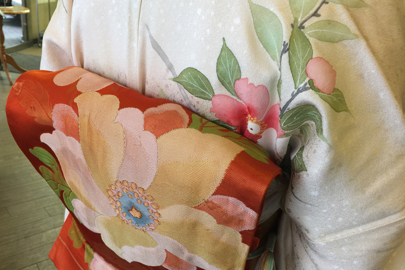 ご予約が入っていたとは言え、新年早々から美しいきもの姿のお手伝いができるなんて幸せいっぱいでっす。お一人目はレースのような織り柄の色無地に袋帯、の上からキャメル色のマント。お二人目は薄いクリーム時に咲いた真っ赤な花柄がとってもよくお似合いの訪問着に袋帯。お二人とも行き先は同じですが、それぞれの個性を引き立てるにはもってこいのコーディネート。
