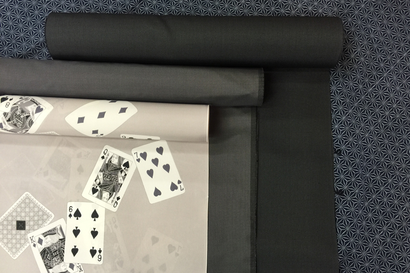 「来月半ばに外国の方とお会いする機会があって、せっかくですからきものを着ようと思って」とは九州男児いやニッポン男児として素晴らしい心掛けじゃありませんか。そもそも地味好みな上に茶道のお稽古にも精進されているお客様、山形県は米沢で織られた黒地に灰色の細い縞の紬をきものに、藍鼠がお洒落でで小さな千鳥格子の大島紬を羽織に。唯一の楽しみである羽織の裏地選びも地味な方へと傾きはじめたのですが、「男のお洒落はここしかない!」とモノクロなトランプ柄に決定!