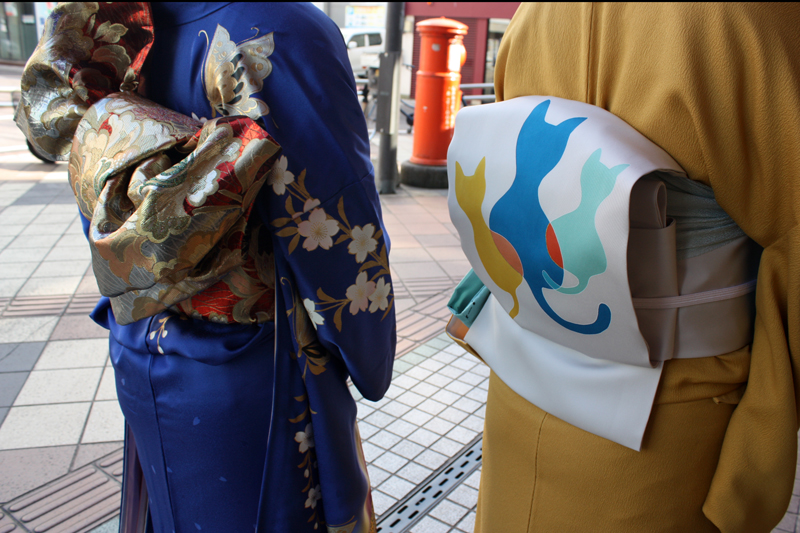 二十歳の記念日は頑張っていた留学先の海外で迎えられて、成人式の晴れ姿を撮り忘れてたというお客様。ようやく落ち着いた今日この頃に撮影に臨まれる本日、お嬢様は太陽の光に輝く海のような青が斬新な振袖、お母様は先日の大決算市!でお誂えになったばかりの猫の帯を色無地に合わせて。きものの色はまさに対照的ですが、毎日いろんなことをたくさんお話ししてとにかく仲の良い姉妹のような母娘。