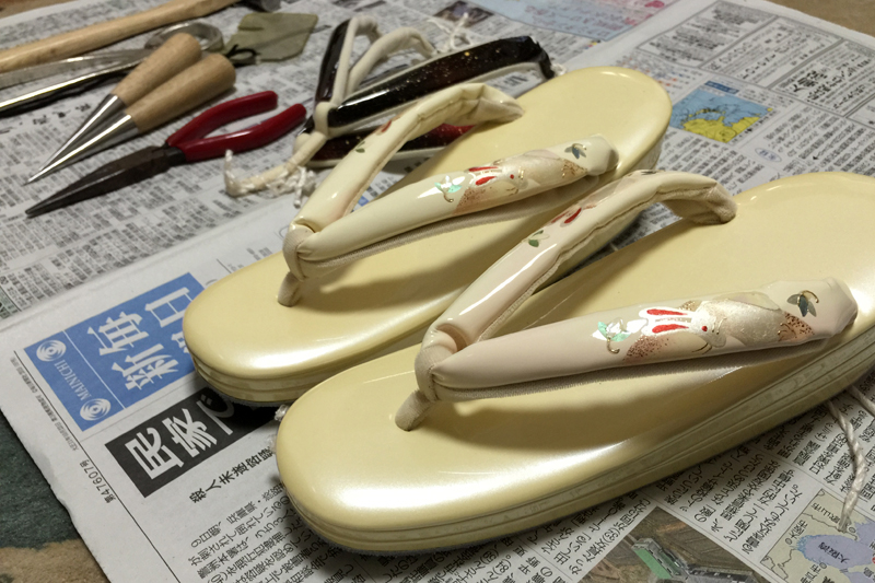 先日着付けをお手伝いした折にお履きになっていた草履をお持ち込みになったので、カカトのゴムが外れでもしたのかと思ったら、「持ってるもう一つの鼻緒とすげ替えてほしいんです」とのこと。ずいぶん履かれたのか、もともとすげてあった赤と黒の鼻緒は表の生地が裂けていました。新しく挿げたうさぎの鼻緒は台のクリームと似たような色でしたが、うさぎの耳と目の真っ赤がかえって目立って可愛らしい印象に。