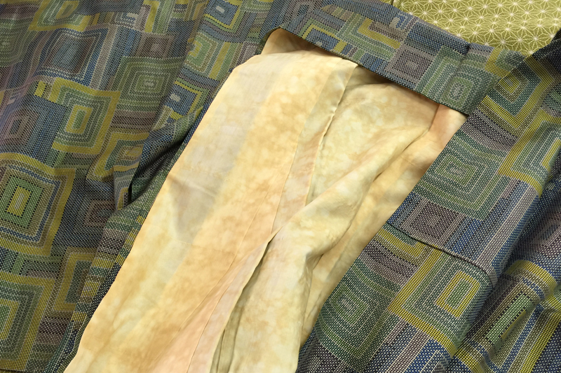 幾何学模様の、色もお洒落な大島紬を洗い張り+仕立てでお預かりしました。