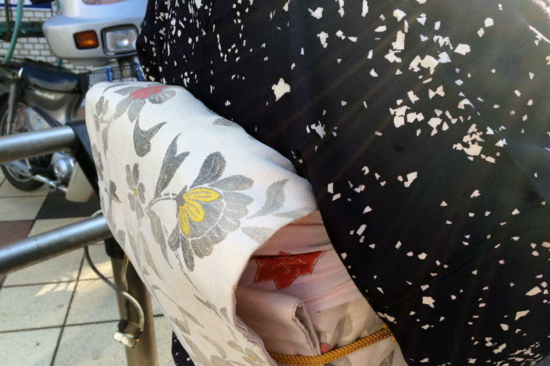 「ちょっと助けてください!」と慌てた声。なんでも、今日に限って名古屋帯がうまく結べないそう。「すぐどうぞ」と15分後にはご来店。問題の名古屋帯は触ってみると確かに硬い帯で、しかもちょっと短め。ちょちょいと結んで差し上げているうちに年長さんのお坊っちゃまが着てきた木綿の着物を脱いじゃったのはご愛嬌。これから坊ちゃんをお供にお茶のお稽古に福岡まで。紺色の小紋に可愛らしい名古屋帯。帯揚げで赤い紅葉の秋をちょっと添えて。