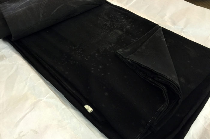 雨上がりの朝一番、風呂敷を手にお客様がいらっしゃいました。以前から気になっていたという黒紋付のお手入れをご相談に。「桐の箪笥にしまってはいたんですけど、、、」と桐の箪笥だったら大丈夫という神話が今もなお語り継がれているようですね。衣類に適度な湿度に調節するチカラを持っている桐箪笥と言えど、半年以上開けもせずに空気を入れ替えずにいるとこうなってしまう可能性は大大大。