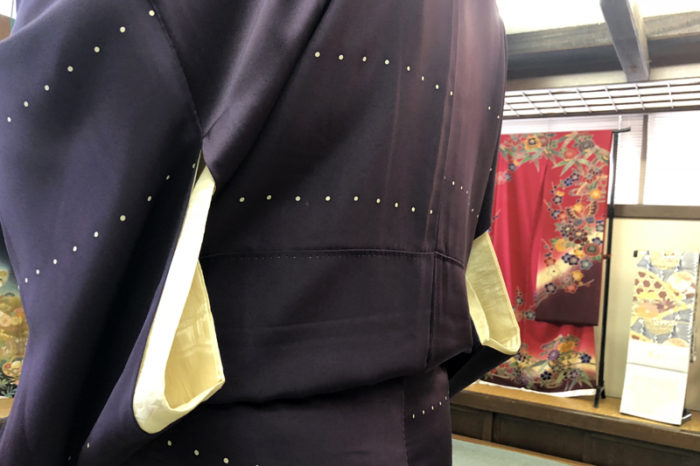 若女将曰く「前回お召しになった時には、そばで見ているだけで大丈夫だったと思うんですけど、、、」というほどの腕前まで上達されていたのですが、しばらくお稽古を休まれていたり、まったくお召しになっていなかったことが「次は腰紐か、コーリンベルトか、伊達〆か、、、」と手つきを鈍らせてしまった模様。しかーも!帯を忘れて来られるという大失態には「小学生の頃は忘れ物なんてしたことなかったですけど、、、」とコメントに困ってしまうコメント付き。これはちょうどいい!と、きものの着方のみの集中レッスン再開。長襦袢の袂が振りから顔を出しているのはご愛嬌で。