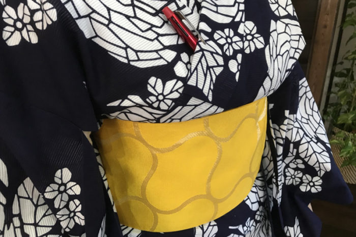 夏祭りの司会などを担当するスタッフのために施設長が誂えた浴衣。風通しの良い綿絽地に、昔ながらの注染めで意匠化された薔薇の花が粋な一枚。「実はどんな浴衣か心配でした、」と自前の浴衣を用意されていたスタッフ。ところが畳紙を開いた途端に「あら素敵!」と用意されていた浴衣のことはすっかり忘れてしまって早速着付てあげると、「着てみるとさらに素敵!」と御満悦!夜の帳が下りた夏祭りの会場で、濃紺と白のコントラストに黄色い帯が眩く輝いていました。