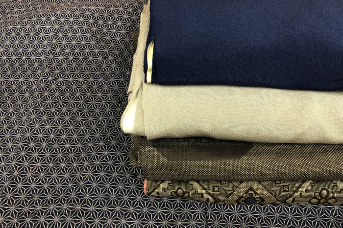 さっそく拝見した1枚目は、擦り切れた袖口や裾まわり(いわゆる八掛)を直して欲しいという大島紬。「軽くて着やすいから、ついこの大島ばかりを着てしまって」と、衿汚れも一級品。2枚目も大島紬。「知人からもらったんだけど、寸法が大きくって」と新品に近い一枚は、洗い張りをしてお客様の寸法に仕立て直し。3枚目は鬼シボ縮緬の色無地紋付。「一番太ってた時に誂えたから、これも大きいのよ」と、同じく洗い張りをして仕立て直し。そして4枚目は、これまた鬼シボ縮緬の色無地紋付。色を少し濃く染め替えて、家紋も「丸に梅鉢」から「丸に三ツ銀杏」に入れ替えて。